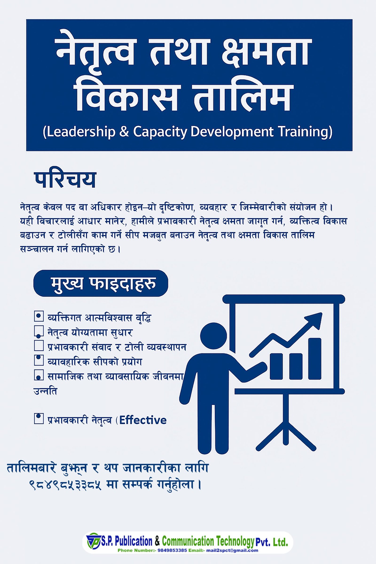 नेतृत्व केवल पद वा अधिकार होइन—यो दृष्टिकोण, व्यवहार र जिम्मेवारीको संयोजन हो। यही विचारलाई आधार मानेर, हामीले प्रभावकारी नेतृत्व क्षमता जागृत गर्न, व्यक्तित्व विकास बढाउन र टोलीसँग काम गर्ने सीप मजबुत बनाउन नेतृत्व तथा क्षमता विकास तालिम सञ्चालन गर्न लागिएको छ।